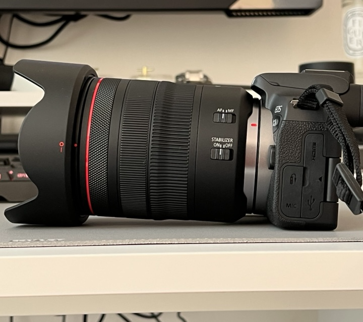 EOS R10의 바디가 워낙 콤팩트해서 렌즈 후드를 씌운 채 책상에 두면 위 사진처럼 앞 부분이 뜨는 것을 볼 수 있습니다.